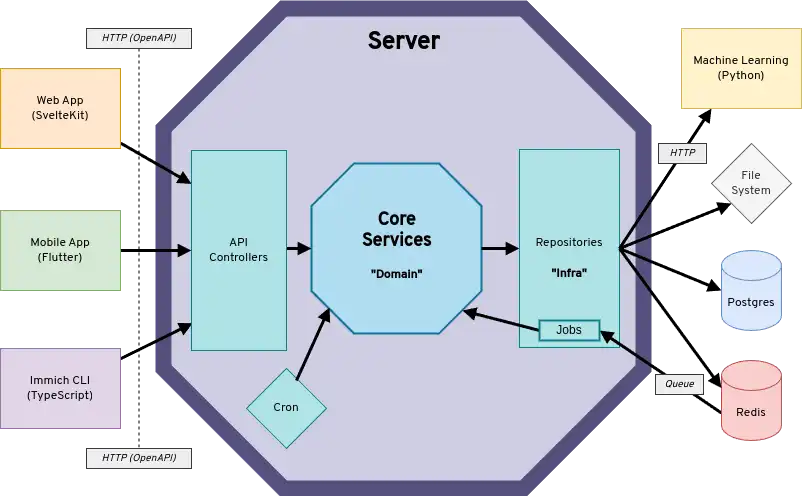 The Immich Server is a TypeScript project written for Node.js. It uses the Nest.js framework, Express server, and the query builder Kysely. The server codebase also loosely follows the Hexagonal Architecture. Specifically, we aim to separate technology specific implementations (src/repositories) from core business logic (src/services).