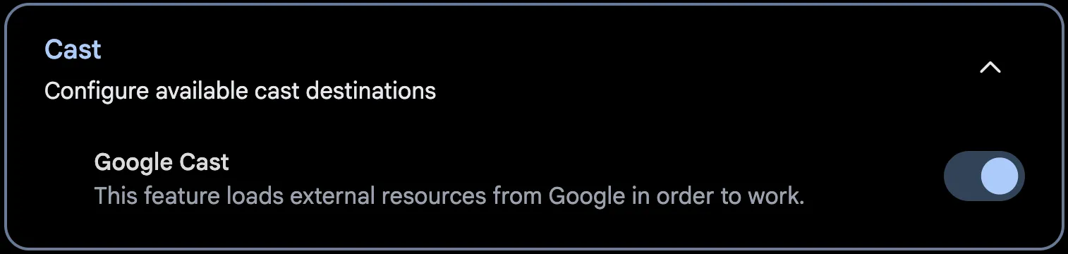 Google Cast support is disabled by default. The web UI uses Google-provided scripts and must retrieve them from Google servers when the page loads. This is a privacy concern for some and is thus opt-in.
