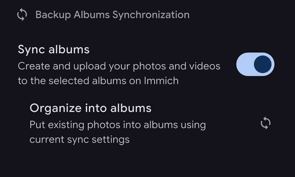 When enabled, Immich automatically creates albums on the server that mirror the albums on your mobile device. Photos and videos are organized into these server-side albums to match your device's album structure, making it easy to find and browse your content the same way you do on your phone.